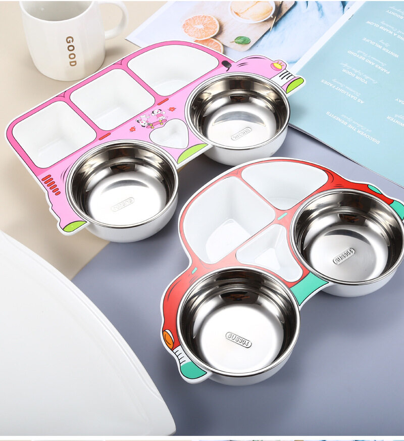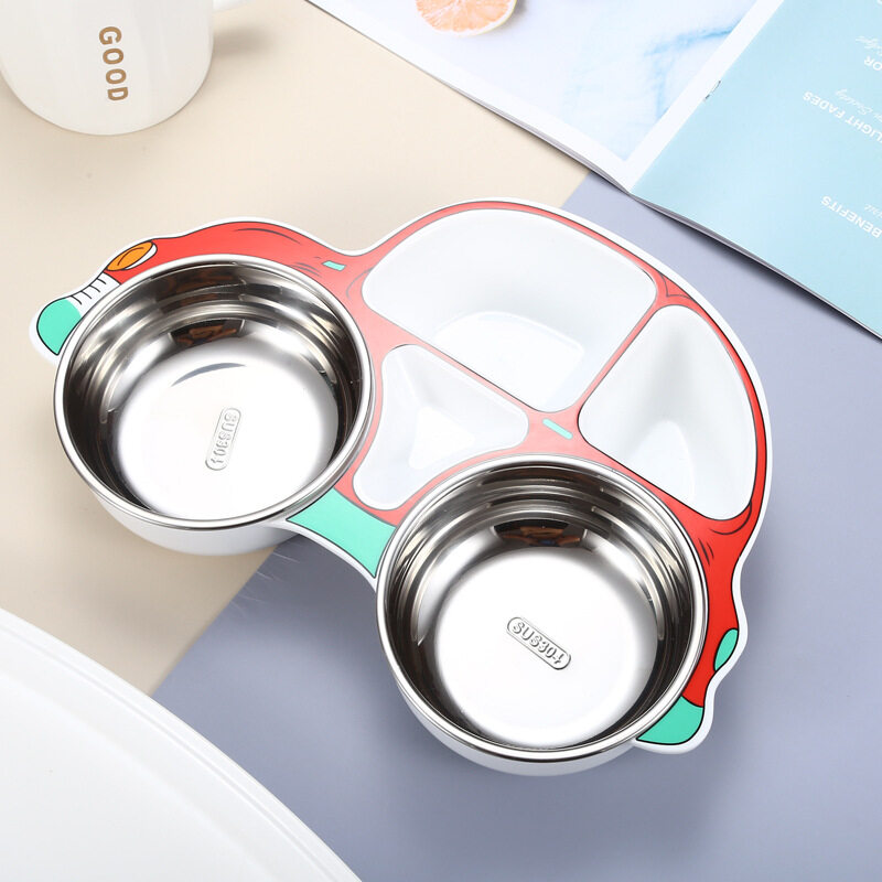 Kocotree Safe stainless steel children's dinner plate 304 stainless steel Cartoon car shape Baby food supplement tableware Anti-scalding partition design Kindergarten gift sets