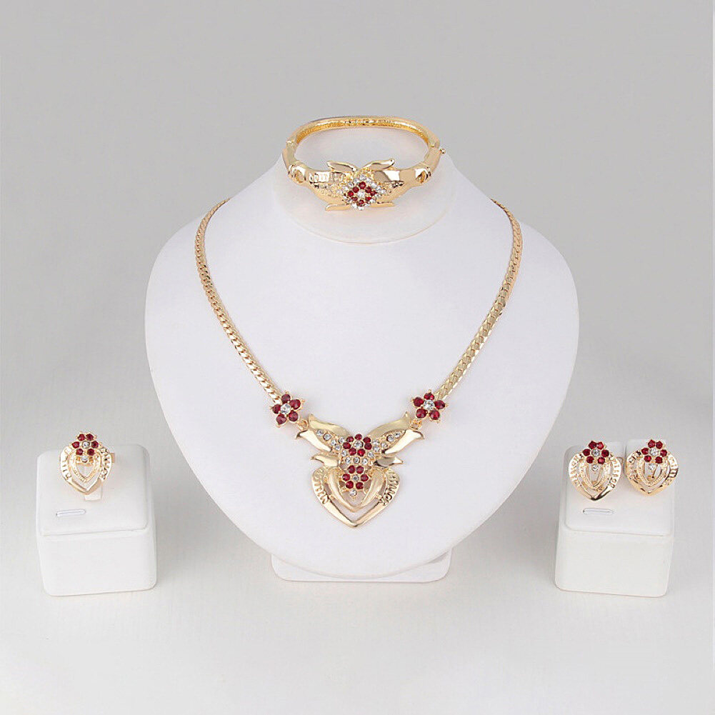 Rhinestone Heart Flower Necklace Stud Earrings Ring Bracelet Women Jewelry Set