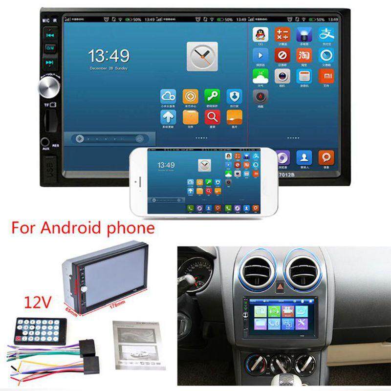 Features: Color: Black Model: 7012B 3rd Material: Plastic + Metal Screen type: TFT Screen size: 7 inch Resolution: 800x480 Power supply voltage: DC 12V Horn impedance: 4 ohms Maximum power: 50W x 4 Volume control: ±8 dB (bass 100HZ, treble 10KHZ) Function: Bluetooth, charger, MP3 players, radio tuner, touch screen, rear view 7'' HD TFT display screen With rear view function Support SD card, U disk play Any state of power failure memory function Built-in Bluetooth function, can match the smart phone Built-in radio AM / FM tuner, automatic search platform function Supports playback of AVI / JPEG / WMA / MP3 / format programs EQ sound control, stereo, left channel, right channel selection/Andriod /IOS Mirror Link Package : 1 x 7012B 3rd Car Radio Player 1 x Remote Controller 1 x Cables Kit 1 x Manual Note: This machine is 12V machine, not according to the 24V power supply