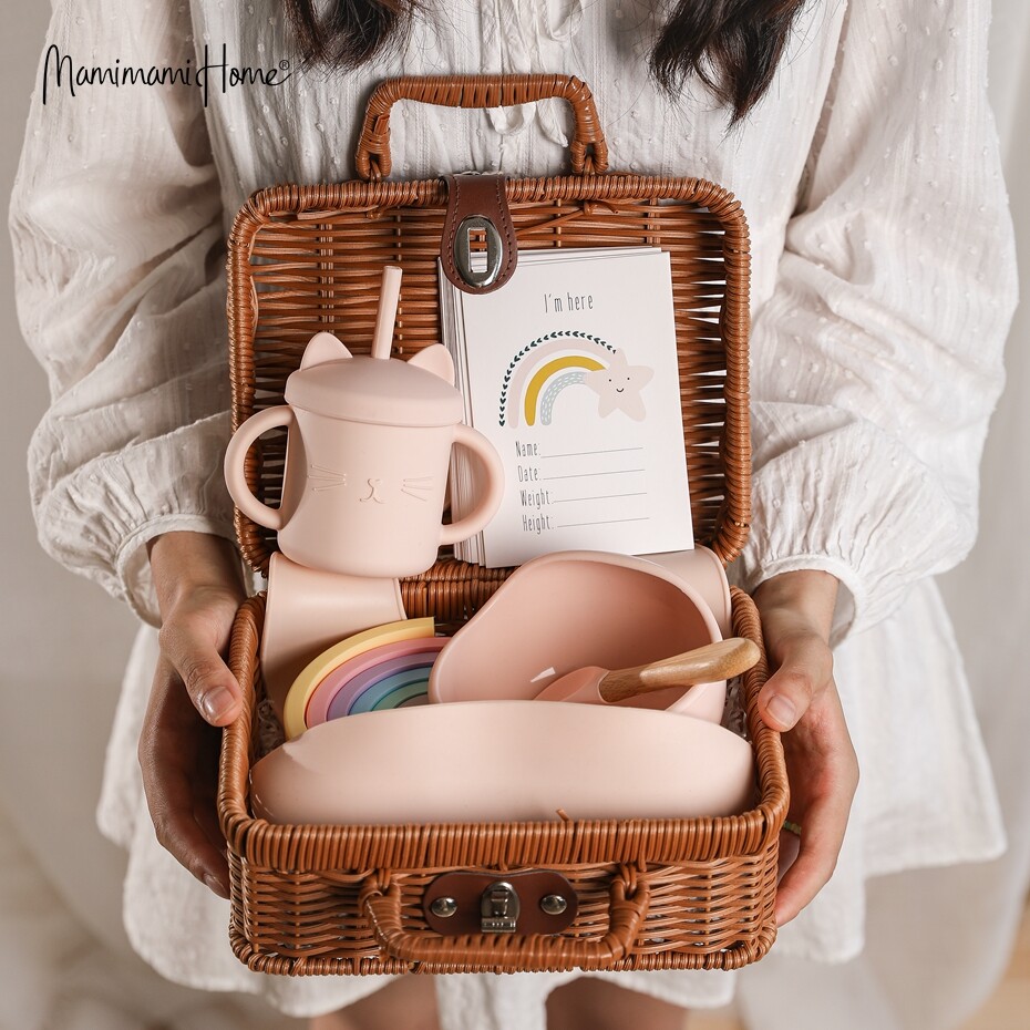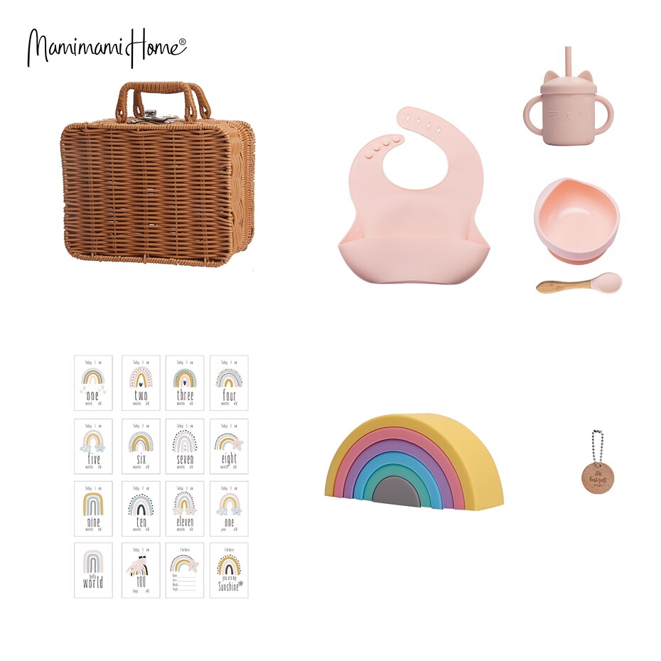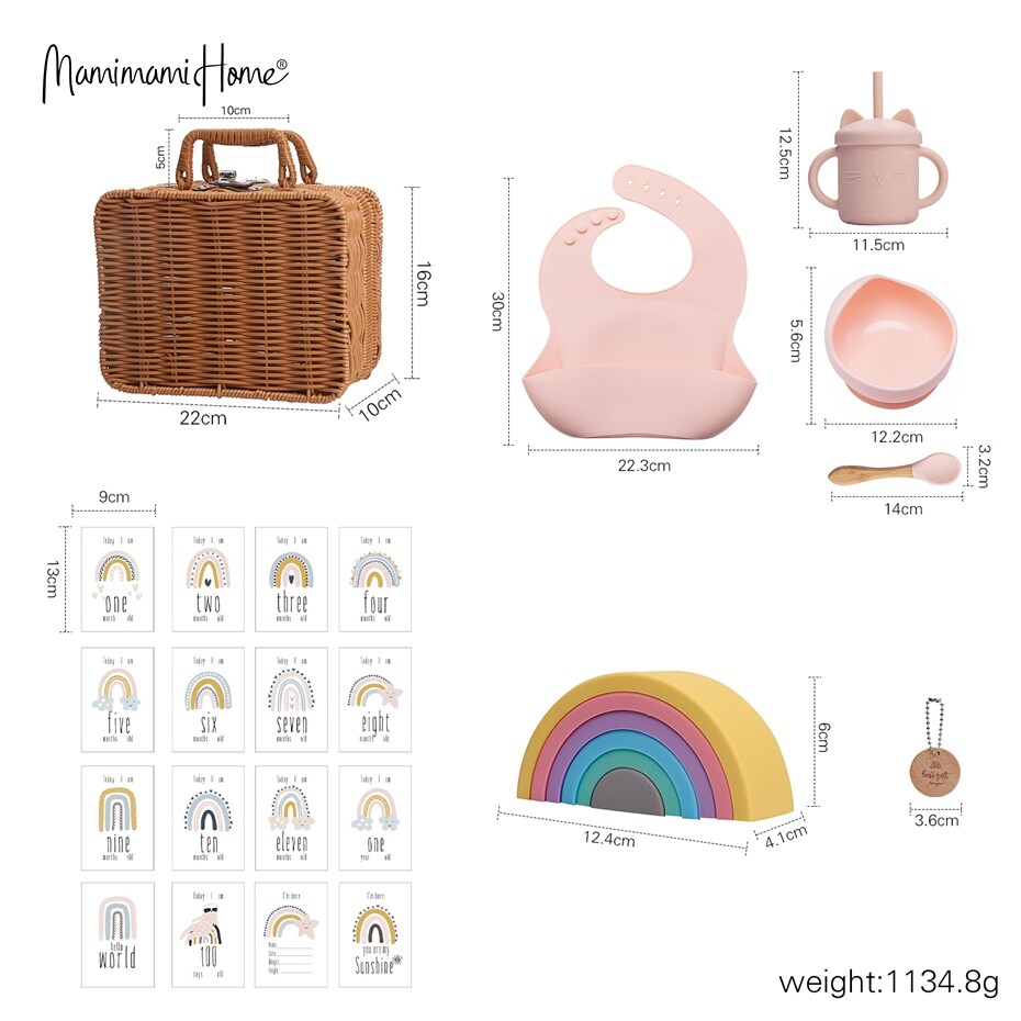 3.Powder Blue Set: 1 x Silicone Bib,1 x Silicone Spoon,1 x Sippy Cup,1 x Silicone Bowl,1 x Silicone Building Block,1 x Rattan Box,16 x Milestone Cards