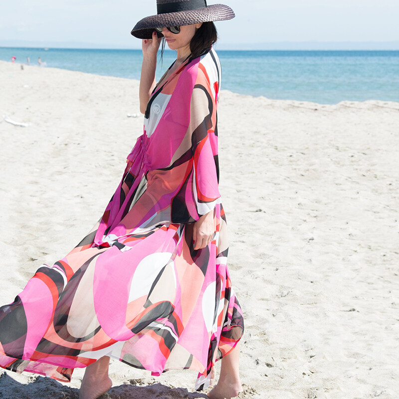 2023 Chiffon Printing Beach Cover Up Tunic Women Drawstring Beach Cardigans Colorful Maxi Dress Bikini Cover Ups