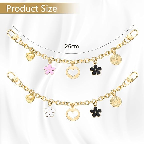 Eye-catching Design: The wallet replacement strap accessory is beautifully designed; the simple chain is paired with black, white, and pink flowers, a hollow heart pendant, and a solid heart pendant, adding a charming look. Reliable and Durable Material: This handbag replacement shoulder strap is made of durable metal through an electroplating process, with a smooth, shiny surface that won't easily damage or deform. High-quality material ensures long-term service.