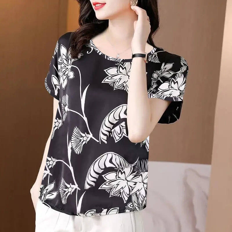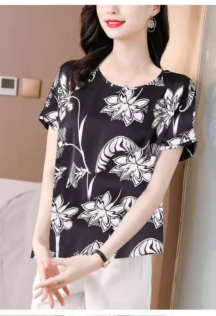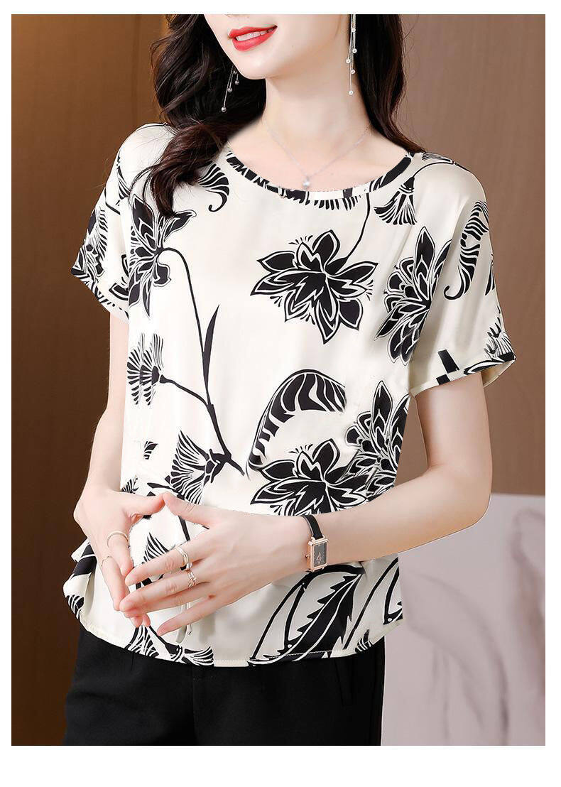 Women's Round Neck Short Sleeve Tops Satin Silk Floral Printed T Shirts