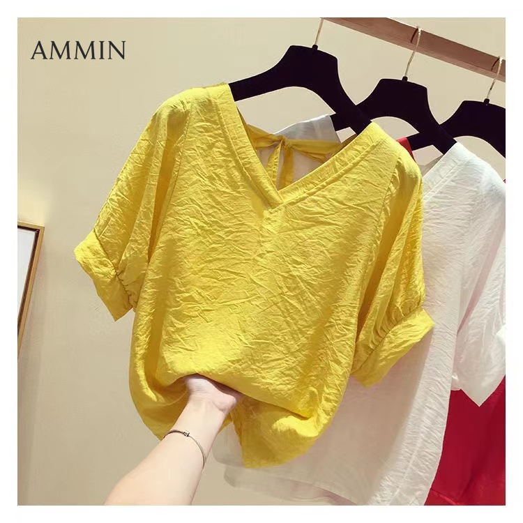 AMMIN Korean Style Short Sleeve Super Fairy Sweet Loose Slim Top For Women 2022 New V-Neck Backless Chiffon Shirt Casual Blouse