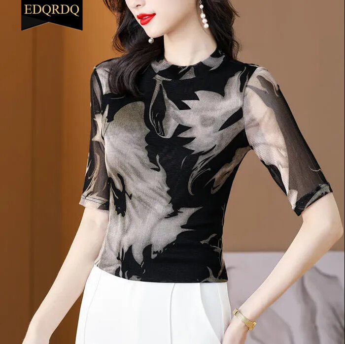 EDQRDQ Women's Tie Dye Mesh Tee Fashion Casual Shirt 3/4 Sleeve Fit Top