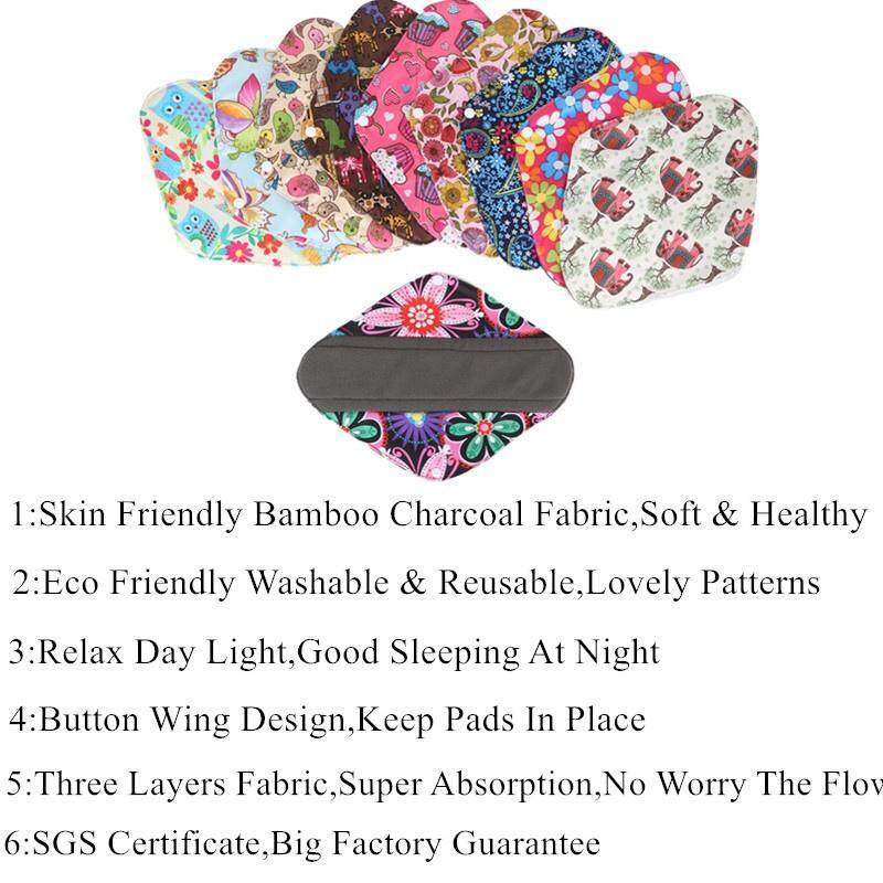 3:The Panty Liner Material: 1 Layer Bamboo Charcoal +1 Layer Microfiber +1 Layer Waterproof Printed PUL