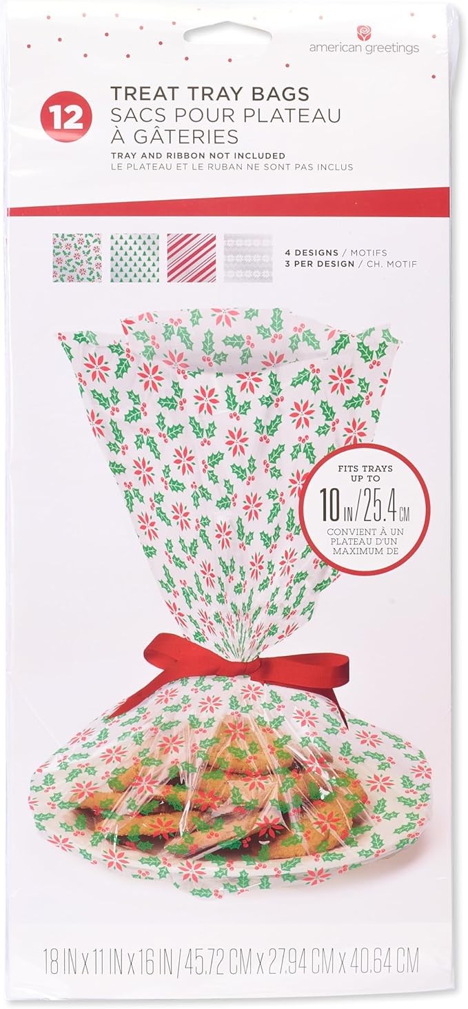 American Greetings Christmas Cellophane Cookie Tray Bags with Twist-Ties, Holiday Patterns (12-Count)