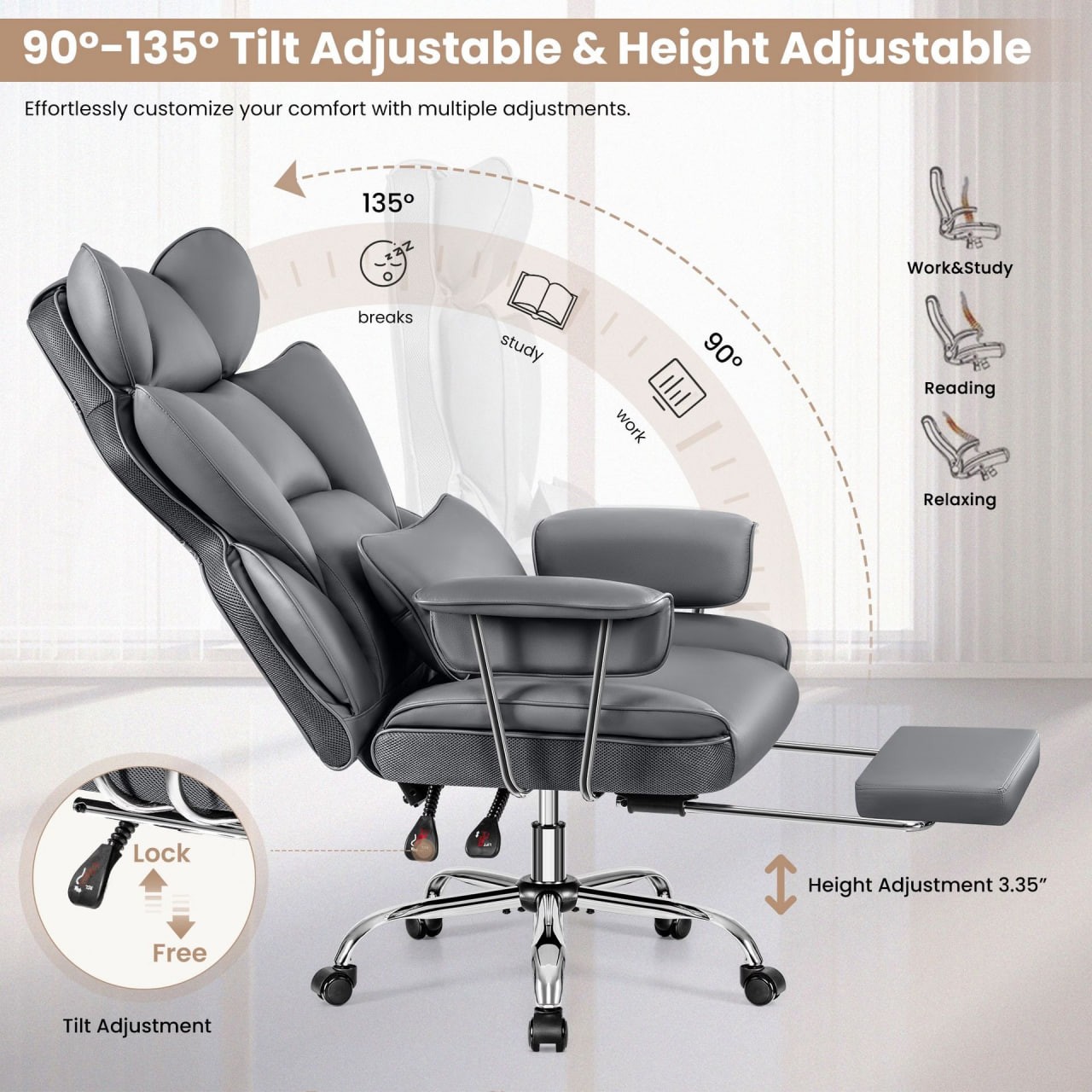 Ergonomic PU Leather Office Chair with Footrest and Lumbar Pillow, Reclining, Gray, 48 lb